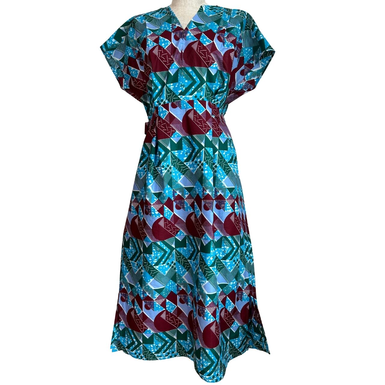 フレンチスリーブワンピース ライトブルー&パープル(日本縫製)|アフリカンプリント アフリカンファブリック アフリカンバティック パーニュ キテンゲ アフリカ布 ガーナ布