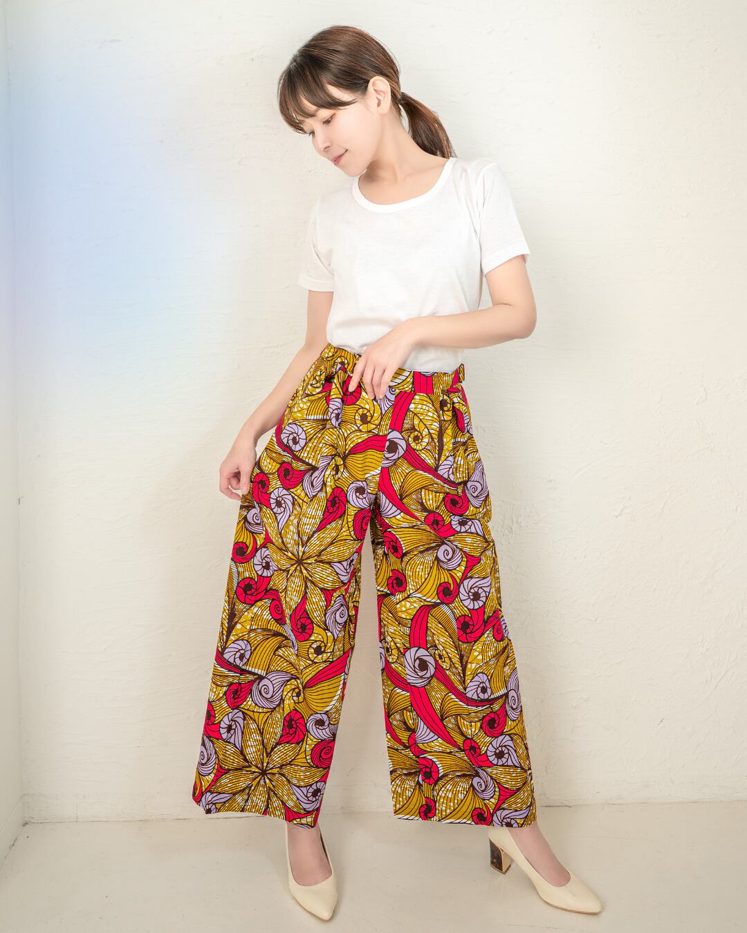 ワイドパンツ カーキ&ピンク(日本縫製)|アフリカンプリント アフリカンファブリック アフリカンバティック パーニュ キテンゲ アフリカ布 ガーナ布
