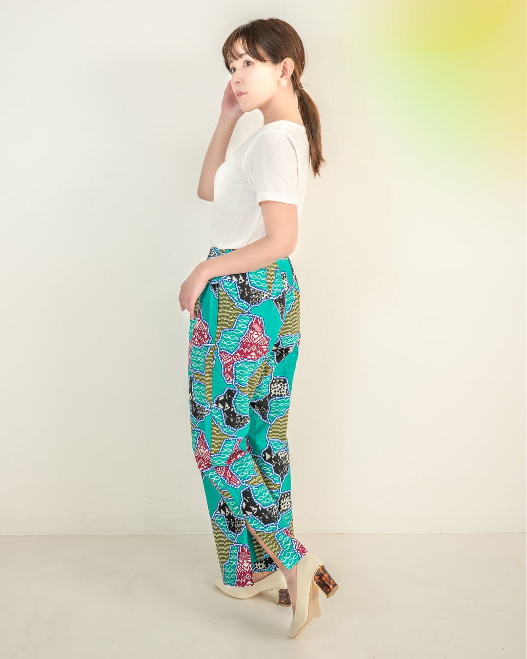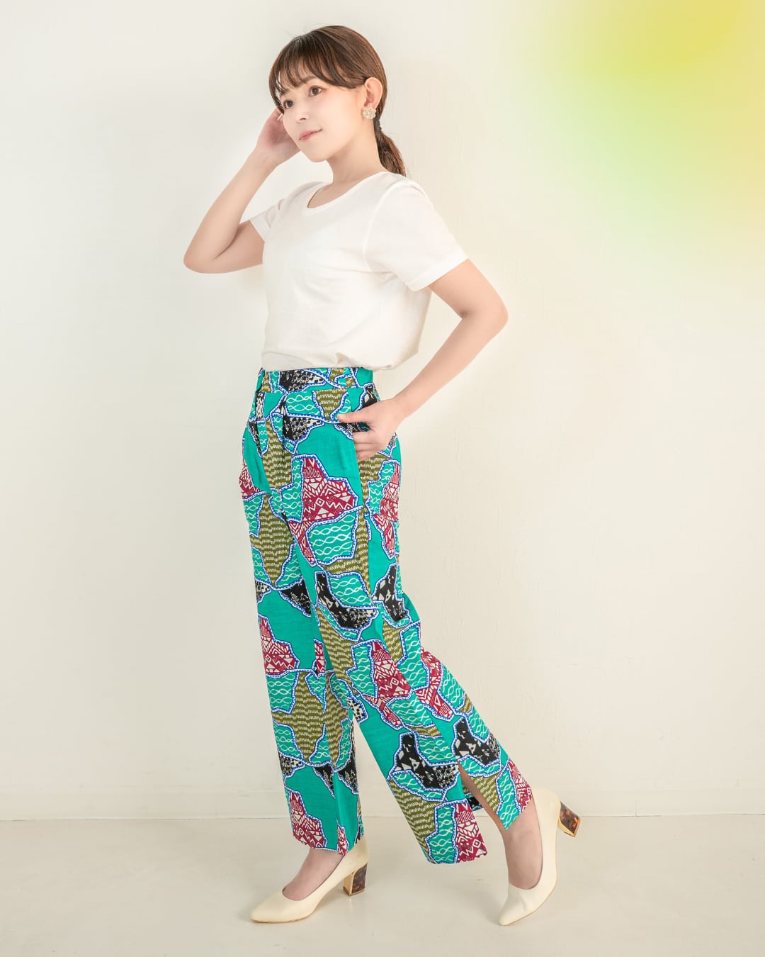 ※スリットパンツ グリーンの柄は同柄のブラウスとは反対向きになっています。