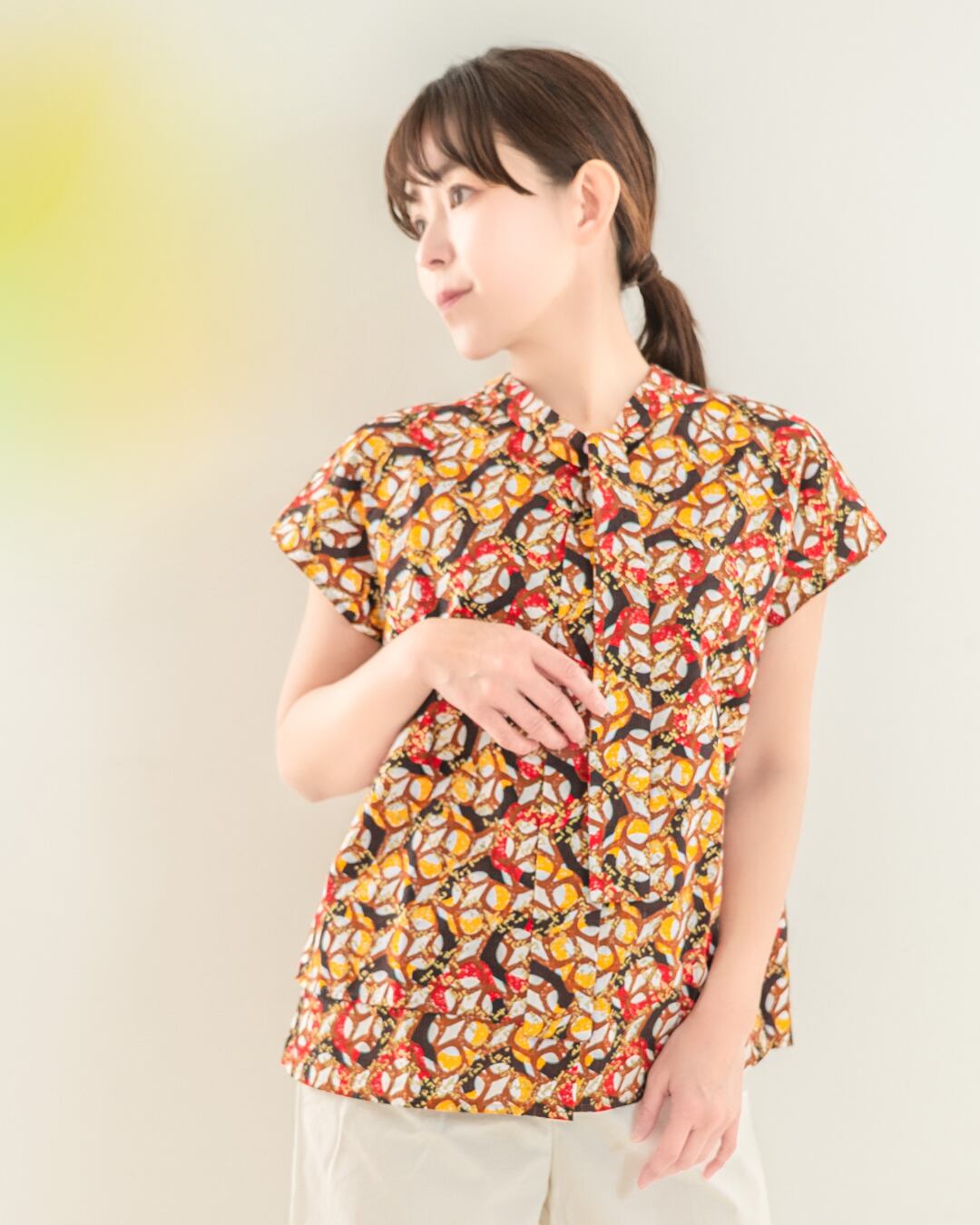 2wayボウタイブラウス リング ブラウン レッド イエロー (ガーナ産上質ファブリック・日本縫製)| アフリカンファブリック アフリカンプリント アフリカンバティック アフリカ布 パーニュ キテンゲ